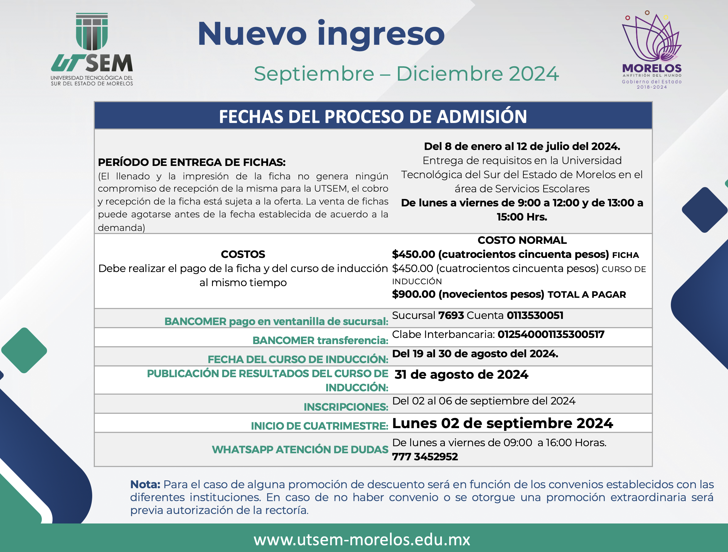 2.- Original y dos copias del Comprobante de pago de ficha. El pago deberá realizarse en ventanilla de BANCOMER Sucursal 7693 Cuenta 0113530051 o Mediante transferencia: Clabe Interbancaria: 012540001135300517 Al comprobante emitido por el banco, deberá colocarle nombre completo, carrera y como concepto de pago poner: Ficha UTSEM Septiembre 2024.